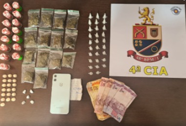 Durante a abordagem, o homem resistiu, sendo necessário o uso de força para contê-lo. Na revista pessoal, foram encontrados um frasco de lança-perfume, um celular e dinheiro em espécie. Próximo ao suspeito, os agentes localizaram uma sacola contendo drogas embaladas e prontas para a venda: 0,054 kg de cocaína, 0,018 kg de maconha, 0,004 kg de “dry” e 30 ml de lança-perfume.