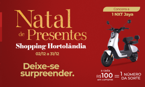 O Shopping Hortolândia iniciou a campanha “Natal de Presentes 2025”, válida de 2 a 31 de dezembro. Os clientes recebem um número da sorte a cada R$100 em compras e participam do sorteio de uma moto elétrica NXT Jaya. A ação busca incentivar as compras e movimentar o clima natalino no centro de compras.